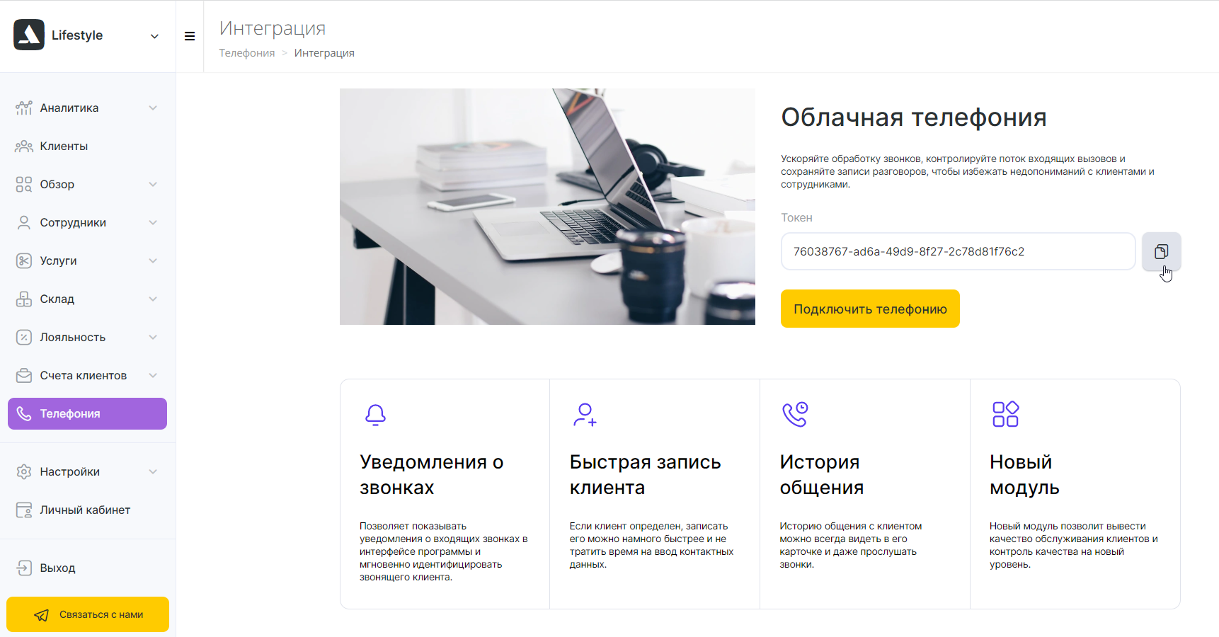 1. В личном кабинете Altegio в верхнем левом углу вы найдете «Филиалы» и «Сети». Выберите сеть, для которой нужно настроить интеграцию, и перейдите в раздел «Телефония». Скопируйте токен телефонии.