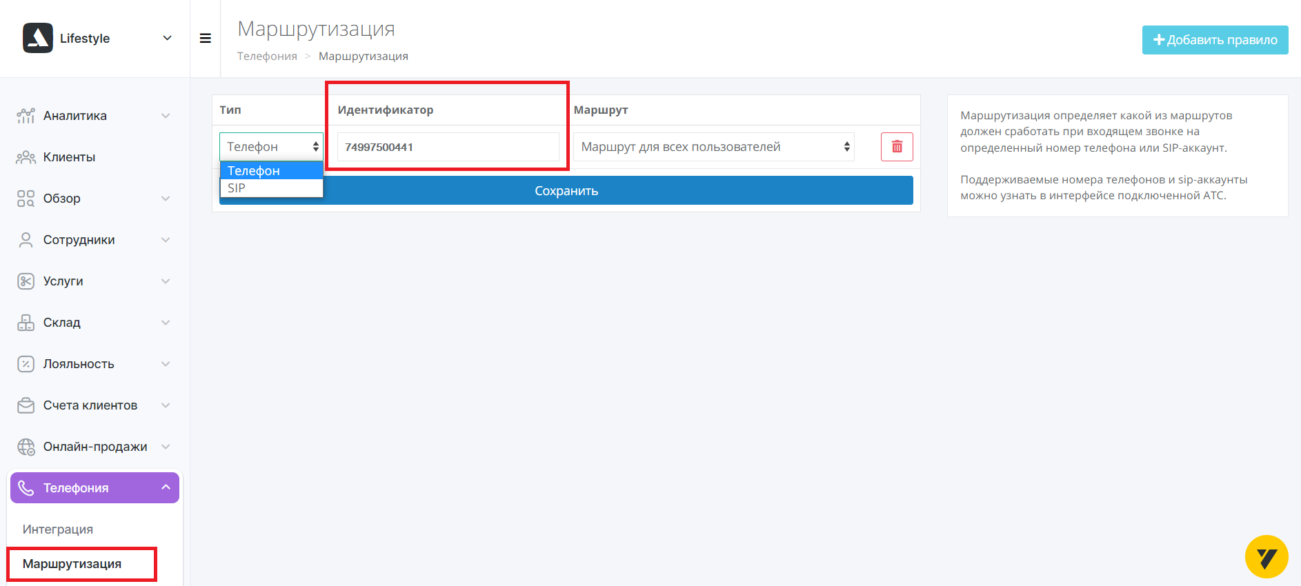 Обратите внимание: маршрутизация определяет какой из маршрутов должен сработать при входящем звонке на определенный номер телефона или SIP-аккаунт.10. В появившемся поле укажите тип, идентификатор и маршрут звонка (по умолчанию это будет «Маршрут для всех пользователей»).