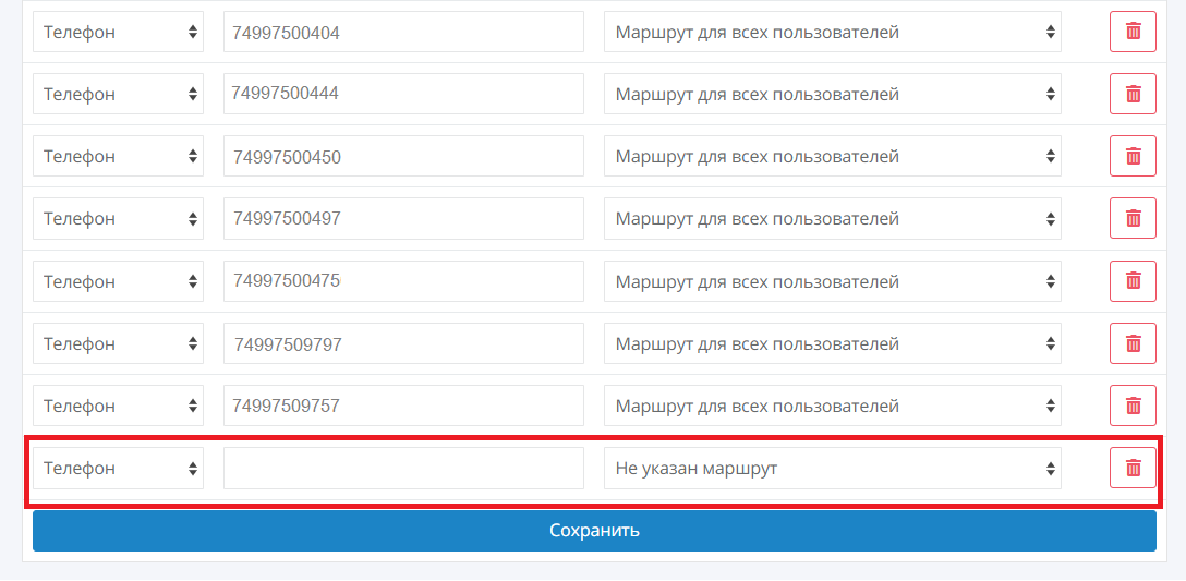 Любая ошибка в номере (лишние символы, пробелы и т. д.) приведет к тому, что звонки не будут обрабатываться. Также звонки не будут передаваться, если номера телефонов заблокированы в АТС.Для того чтобы добавить новое правило, нажмите на кнопку в верхнем правом углу. Пустая строка добавится внизу списка. Укажите в ней номер телефона и маршрут.