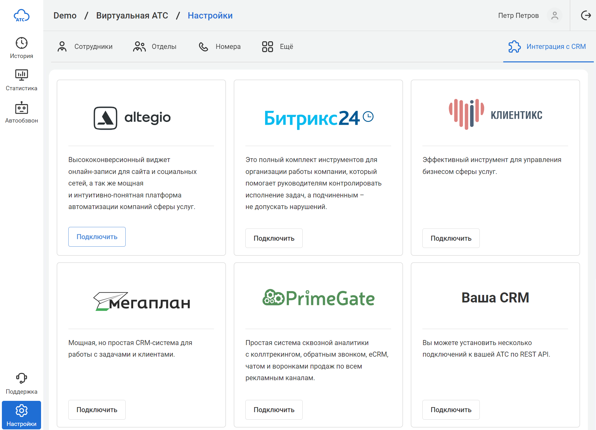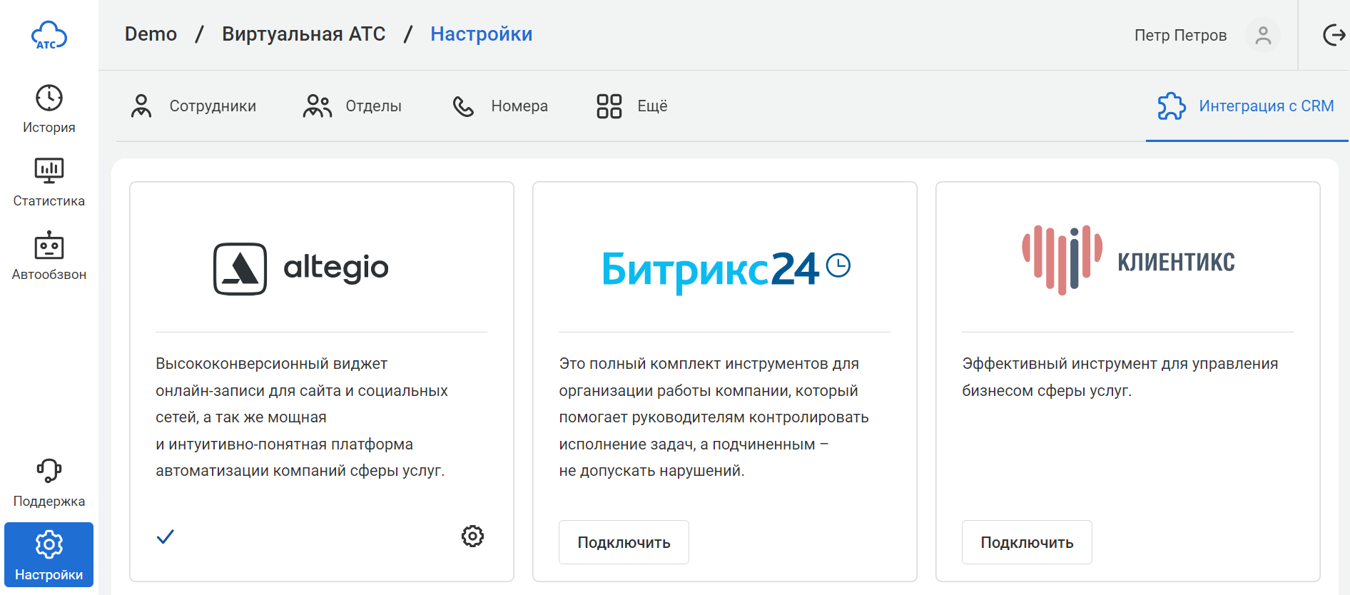 2. Параллельно откройте новую вкладку в браузере и зайдите в личный кабинет Виртуальной АТС. В разделе «Настройки» выберите «Интеграция с CRM» и найдите виджет Altegio. Нажмите «Подключить».