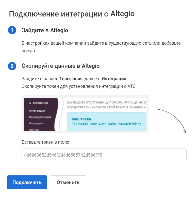 3. В открывшемся окне вставьте скопированный из Altegio токен в соответствующее поле. Нажмите «Подключить».
