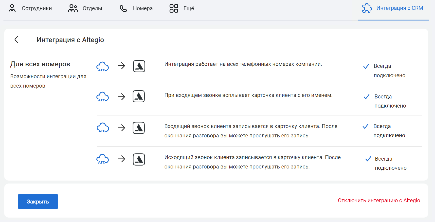 4. В личном кабинете ВАТС вы увидите сообщение «Настройки успешно сохранены». После этого откроются возможности настроенной интеграции. Чтобы закончить настройку, нажмите «Закрыть» внизу экрана.