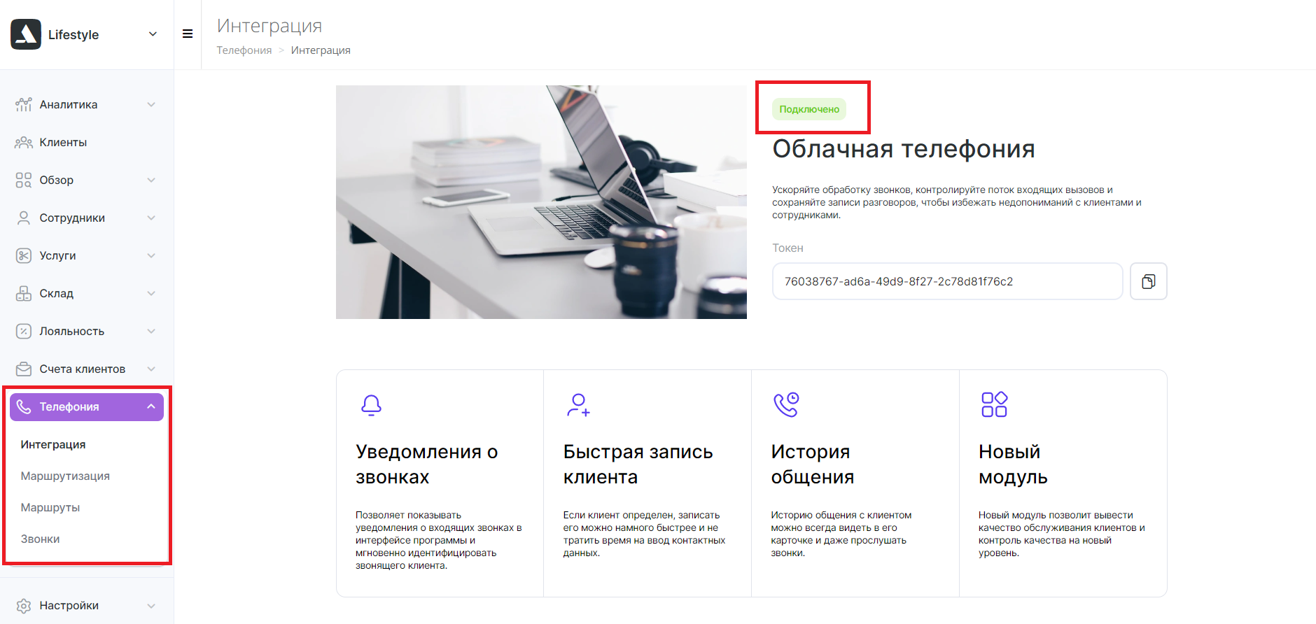 6. Перейдите в Altegio. После выполненных настроек в личном кабинете Altegio в меню «Телефония» появятся дополнительные разделы: «Интеграция», «Маршрутизация», «Маршруты» и «Звонки». При этом статус интеграции изменится на «Подключено».