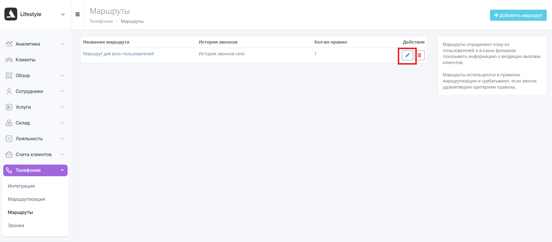7. Перейдите в раздел «Маршруты» и убедитесь, что выбран «Маршрут для всех пользователей», по которому будет идти звонок. Чтобы посмотреть и изменить настройки, нажмите на кнопку «Редактировать».
