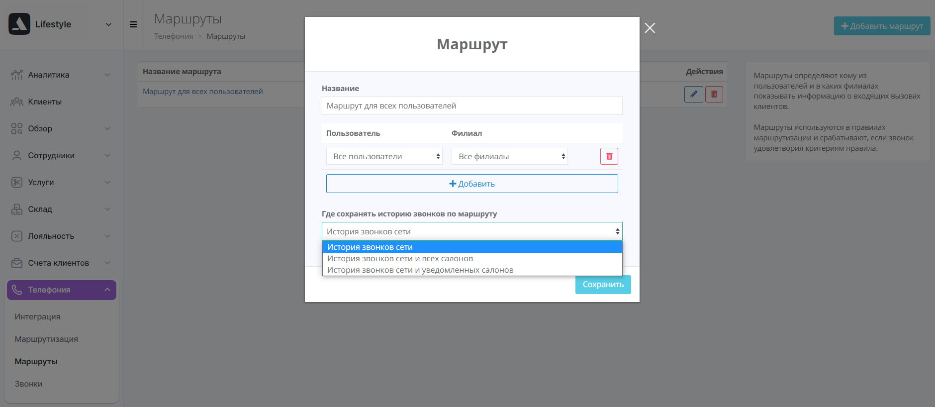 - История звонков сети и уведомленных салонов – всплывающее окно о звонке будет появляться в тех филиалах, которые будут выбраны в этом маршруте.
