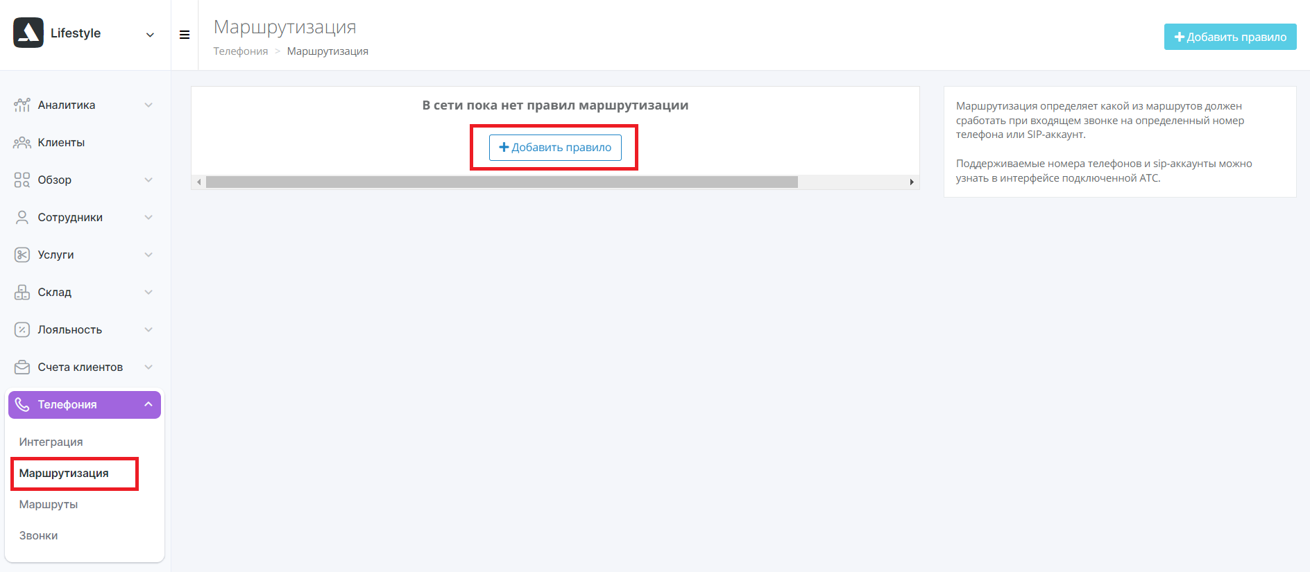 9. После настройки маршрута свяжите его с номером телефона / идентификатором абонента телефонии, на который должны поступать звонки. Для этого перейдите в раздел «Маршрутизация». Вы увидите сообщение: «В сети пока нет правил маршрутизации». Нажмите на кнопку «Добавить правило».