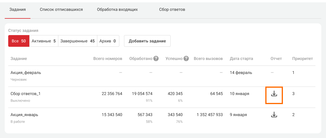 2. Кликните на иконку скачивания отчета напротив интересующего вас задания.