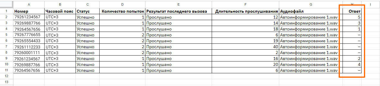 Автоинформирование позволяет не только автоматизировать процесс обзвона, но и получить от клиентов обратную связь, не привлекая к этому сотрудников. Благодаря этой настройке можно прямо в процессе автоинформирования задать клиентам вопрос, на который они смогут ответить, нажав кнопку на телефоне. Результаты опроса будут собраны в информативный отчет в виде таблицы, которую можно скачать и проанализировать.