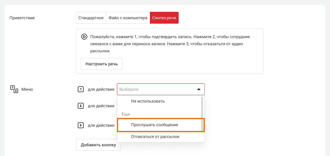 Пример сообщения для опроса: «Пожалуйста, нажмите 1, чтобы подтвердить запись. Нажмите 2, чтобы сотрудник связался с вами для переноса записи. Нажмите 3, чтобы отказаться от аудиорассылки.»