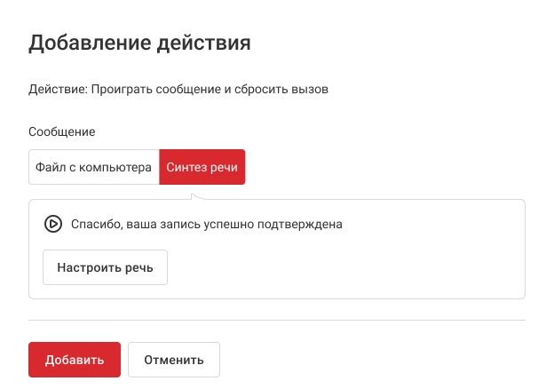 В нашем примере нажатие на кнопку 1 подтверждает запись. Значит, для кнопки 1 можно добавить следующее аудиосообщение: «Спасибо, ваша запись успешно подтверждена.»