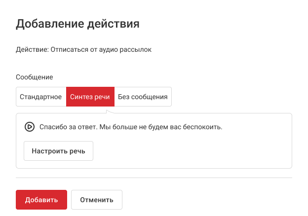 Для действия «Отписаться от рассылок» можно выбрать настройку «Без сообщения», тогда звонок для клиента завершится сразу после нажатия соответствующей кнопки.