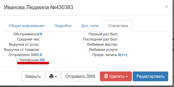 - в разделе «Статистика», нажав на значение поля «Телефония»;