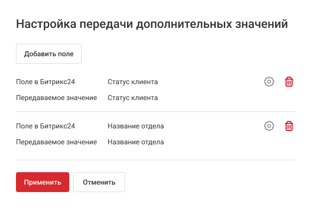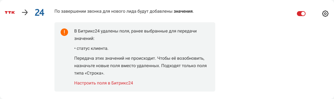 Чтобы возобновить передачу данных, добавьте поле в Битрикс24 и заново сопоставьте его в АТС с нужным значением.