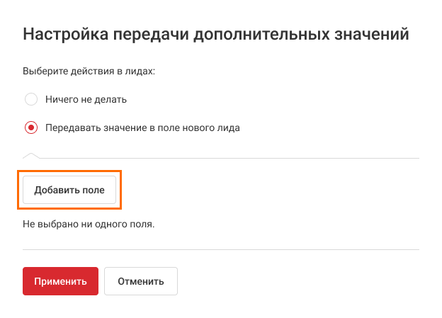 Чтобы новые поля отображались в карточке лида:1. Найдите в карточке раздел с информацией о лиде и нажмите «Выбрать поле».
