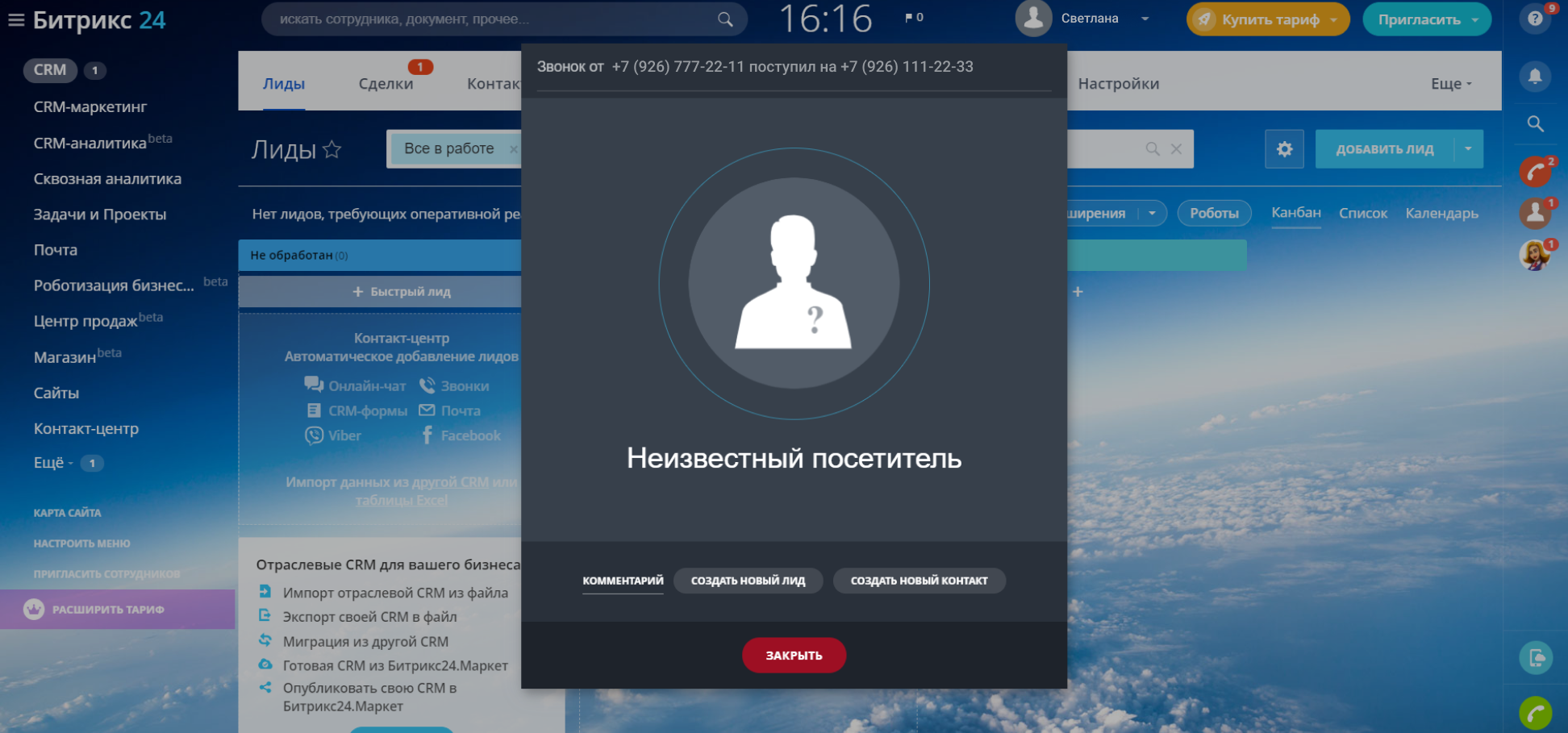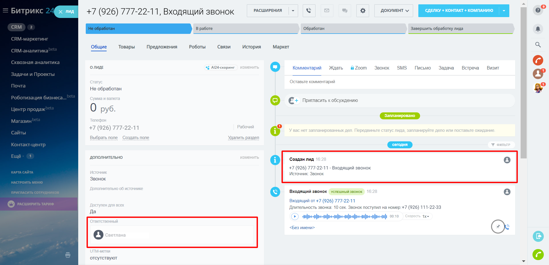 Если никто из сотрудников не ответит на звонок, вы не потеряете этого клиента – лид или контакт все равно будет создан, и вы сможете обработать его позже.