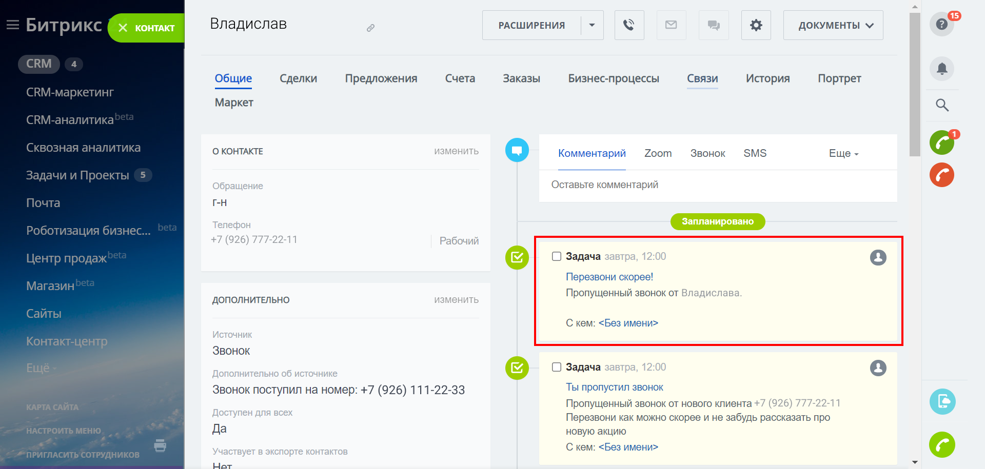 Таким же образом можно автоматически создавать задачи. Они привлекут внимание менеджеров к клиентам и сделкам и подскажут, что нужно делать в каждой ситуации – при пропущенном и принятом вызове от существующего контакта или с незнакомого номера.