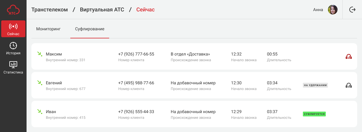 В ВАТС видны все активные звонки компании. Во вкладке «Суфлирование» по каждому вызову отображается время начала разговора и его длительность. Иконка наушников справа показывает, что к вызову можно подключиться. Также здесь отображается происхождение каждого звонка — исходящий он или входящий. Про входящие звонки можно узнать, куда именно позвонил клиент.