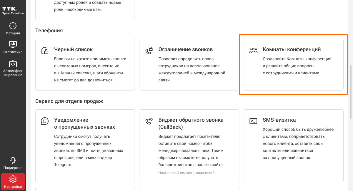 1. В настройках Виртуальной АТС нажмите кнопку «Еще», и в разделе «Телефония» кликните на «Комнаты конференций».