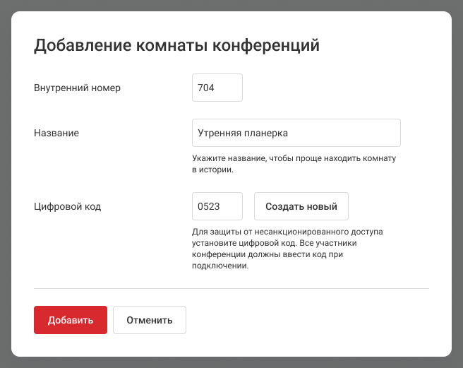3. Придумайте название конференции и внутренний номер (адрес) комнаты. Он поможет участникам быстро присоединиться к встрече.
