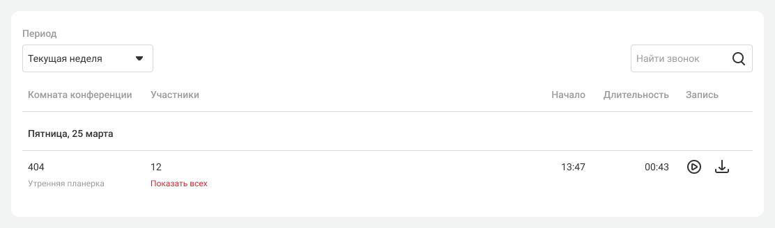 Найти нужную конференцию можно по названию комнаты и дате, а также отфильтровав список конференций по имени участника или номеру телефона. Вы можете не только прослушать запись конференции, но и скачать ее, чтобы отправить коллегам.