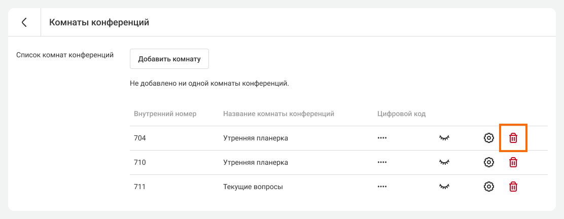 Если комната конференций вам больше не нужна, найдите ее в списке комнат и нажмите на «корзину» справа.