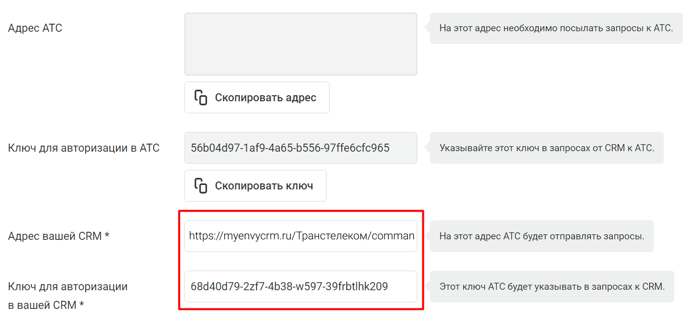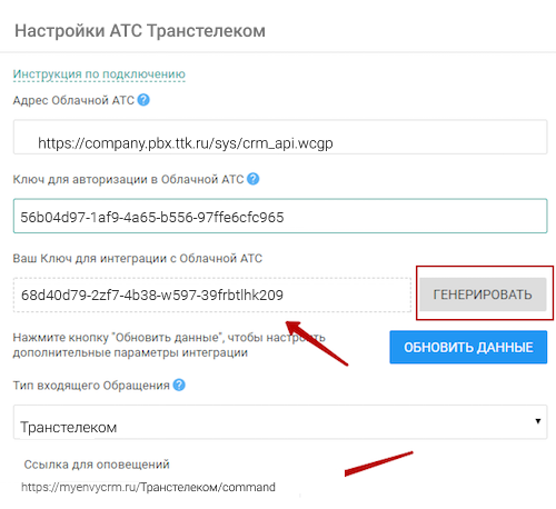 Далее в настройках CRM-системы нажмите «Генерировать», скопируйте сгенерированный ключ и вставьте его в поле «Ключ для авторизации в вашей CRM» в личном кабинете Виртуальной АТС.