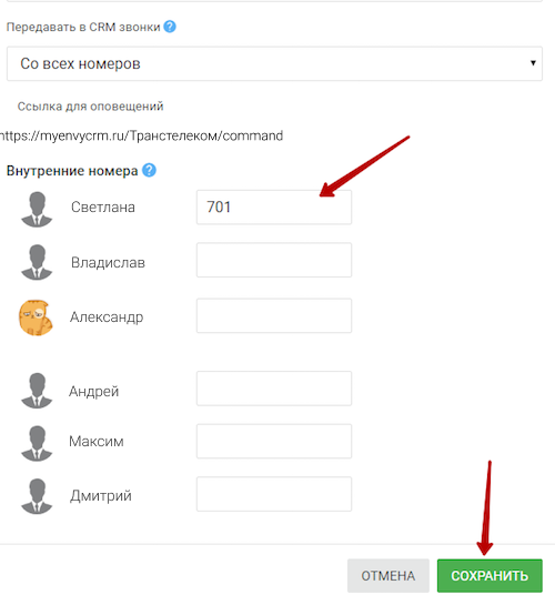 Вернитесь в настройки CRM-системы, укажите внутренние номера сотрудников и нажмите кнопку «Сохранить». На этом интеграция с Виртуальной АТС будет завершена.