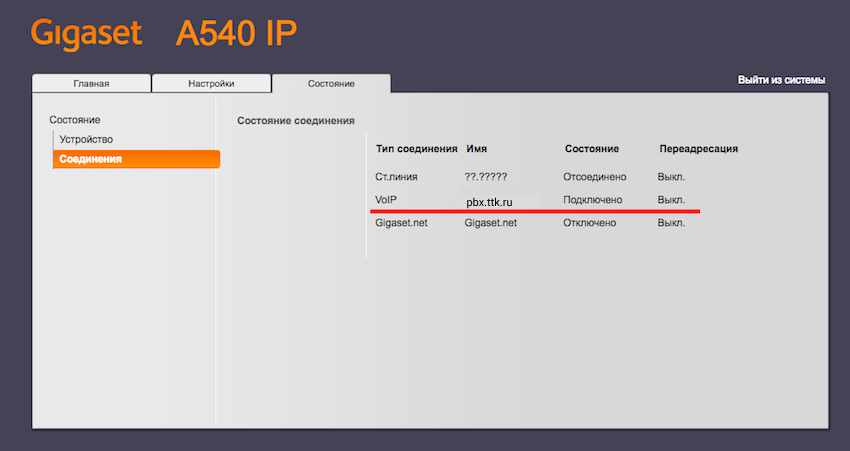 Все, вы закончили настройку IP DECT телефона. В «Состояние» — «Соединения» вы видите соединение Cloud-pbx в статусе «Подключено».
