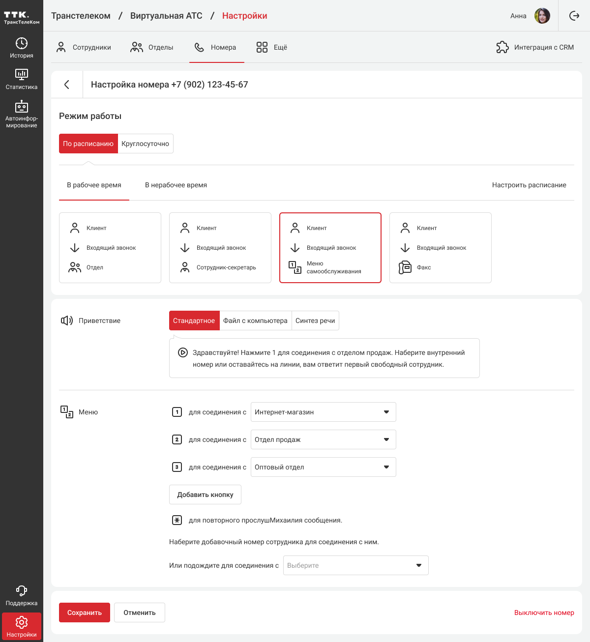 Голосовое меню настраивается отдельно для каждого номера. Перейдите в раздел «Номера» и выберите номер, на котором хотите настроить голосовое меню. Затем выберите режим работы номера и направьте входящие звонки на «Меню самообслуживания».