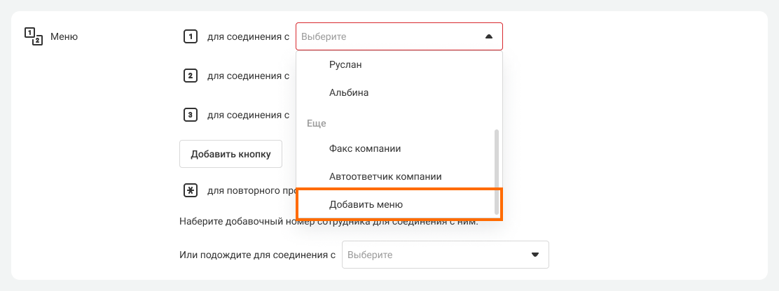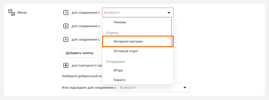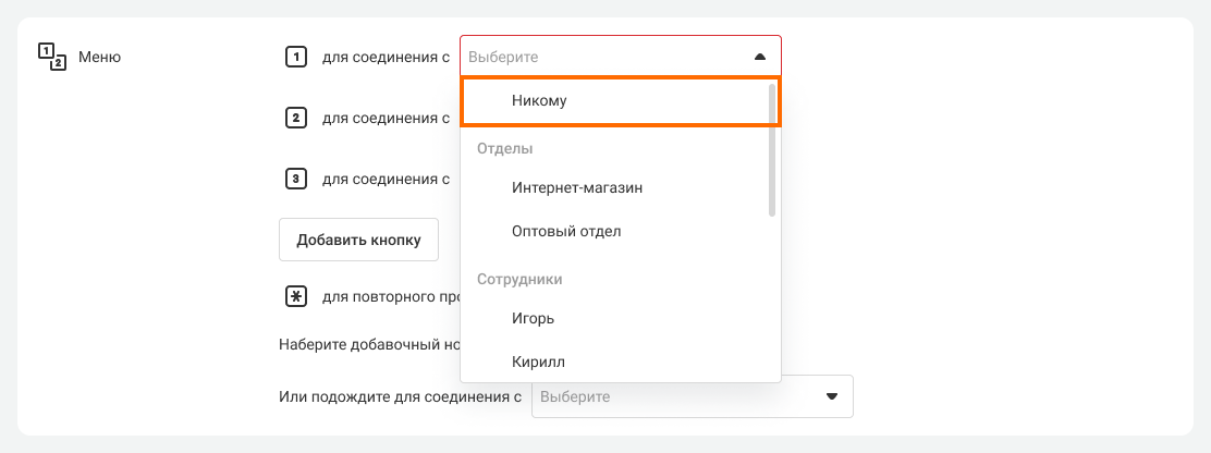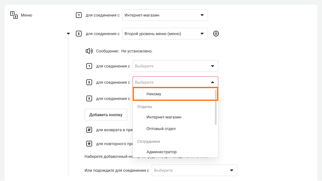 2. Таким же образом выберите, каким отделам или сотрудникам будет поступать звонок при нажатии цифр 2 и 3.
