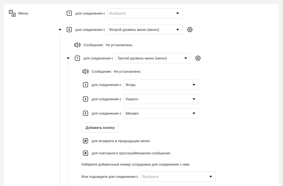 Когда вы снова выберете в раскрывающемся списке, например, «Третий уровень», то откроются все настройки этого уровня — голосовое приветствие, распределение кнопок и вложенные в него уровни.