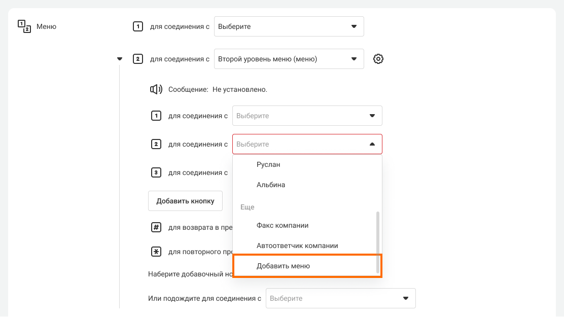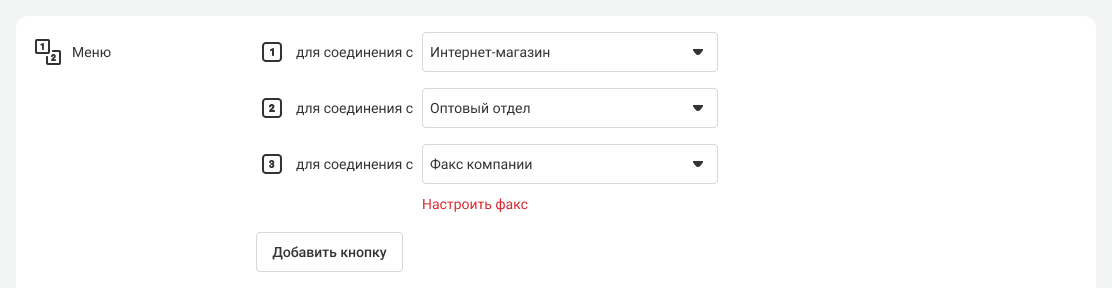1. Чтобы настроить первый уровень меню, укажите, куда направится вызов при нажатии каждой из кнопок. Так, если вы хотите, чтобы при нажатии кнопки «1» клиенту ответил отдел продаж, откройте раскрывающийся список рядом с текстом «1 для соединения с …» и выберите в нем «Отдел продаж».