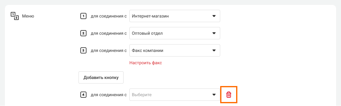 Корзина появляется только у самой последнего пункта, чтобы случайно не удалить цифры в середине списка и не нарушить их логичную последовательность. Иначе можно запутать клиента в вариантах выбора. Представьте, каково пользоваться голосовым меню, в котором, например, можно выбрать только цифры 2, 5, 9 и 0.