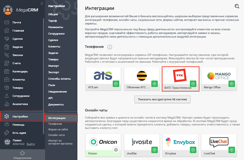 3. В личном кабинете MegaCRM перейдите в раздел “Настройки“ - “Интеграции“ – «Виртуальная АТС».
