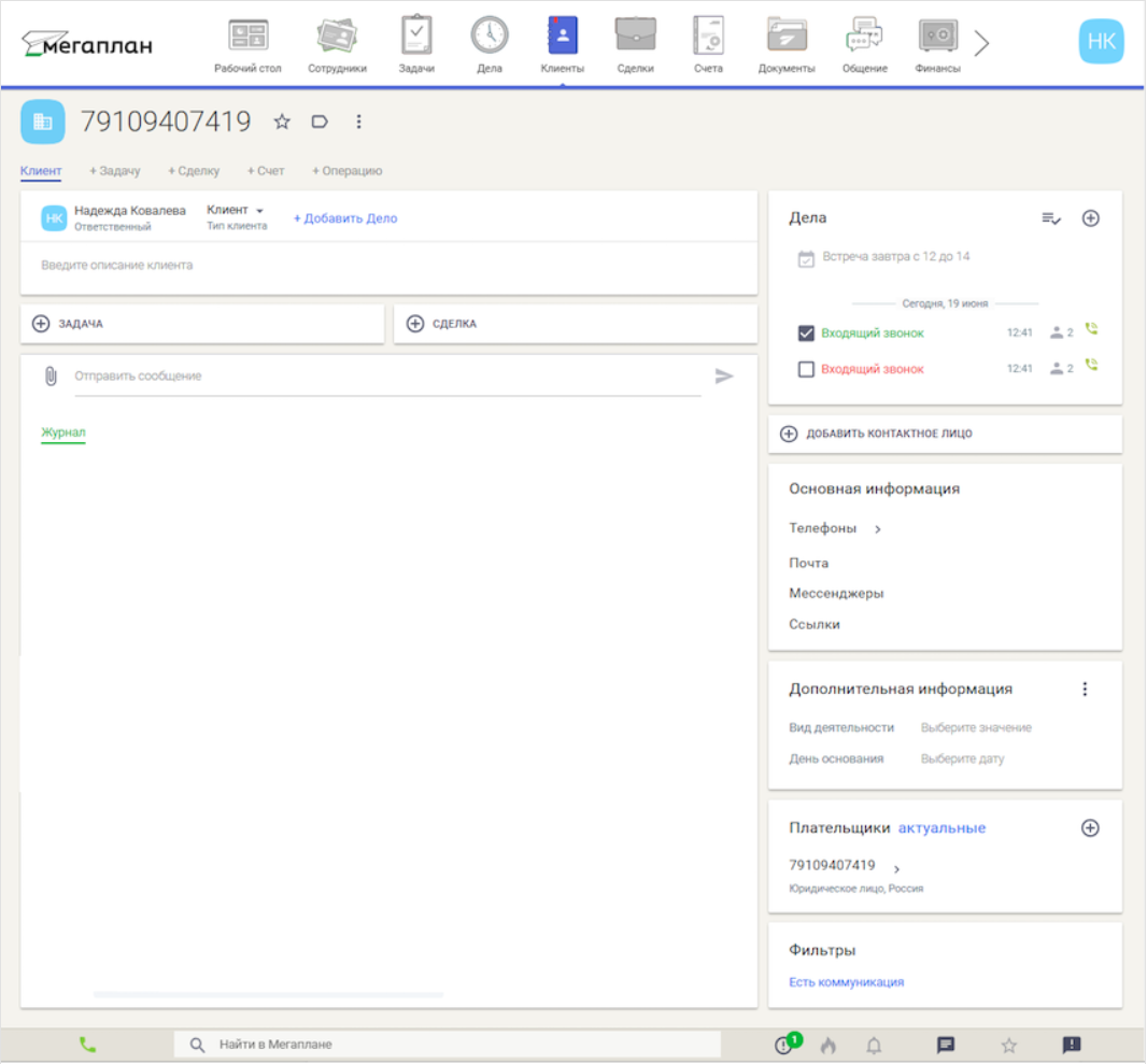При входящем звонке с неизвестного номера создается новый контакт. Менеджер сможет внести в его карточку необходимую информацию сразу или после завершения звонка.