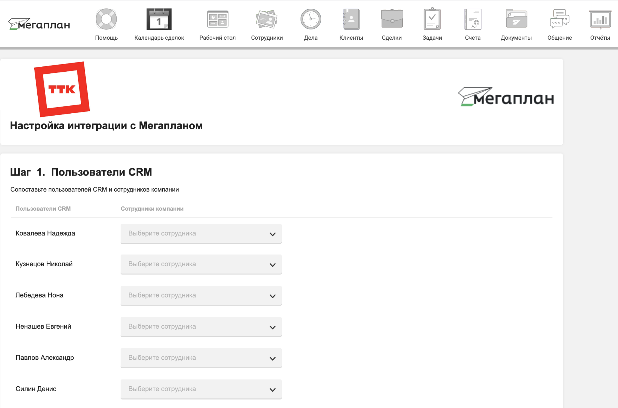 После успешной авторизации сопоставьте пользователей Мегаплана и сотрудников в ВАТС.