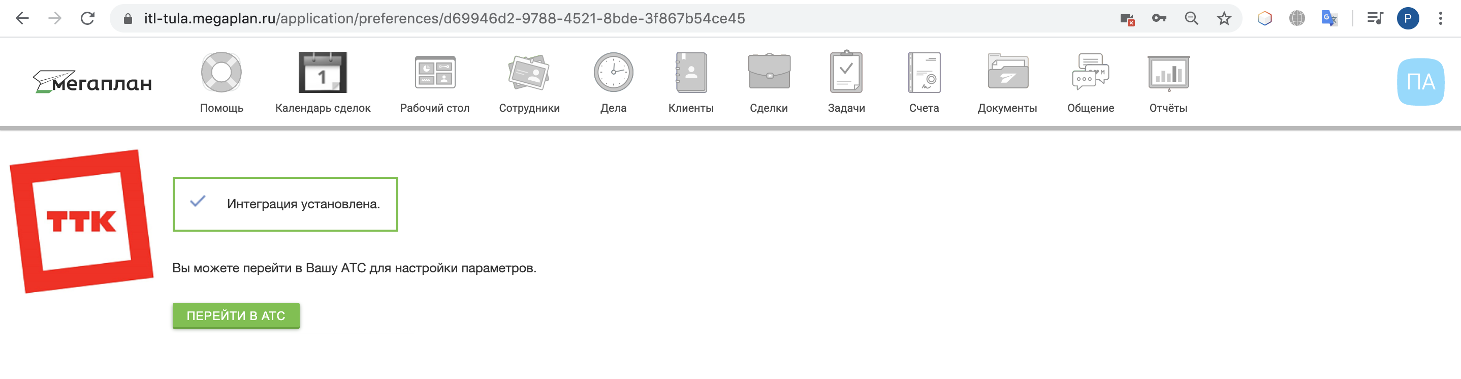 После сохранения настроек вы получите подтверждение успешной установки интеграции. Для изменения настроек вы сможете перейти в свою ВАТС:
