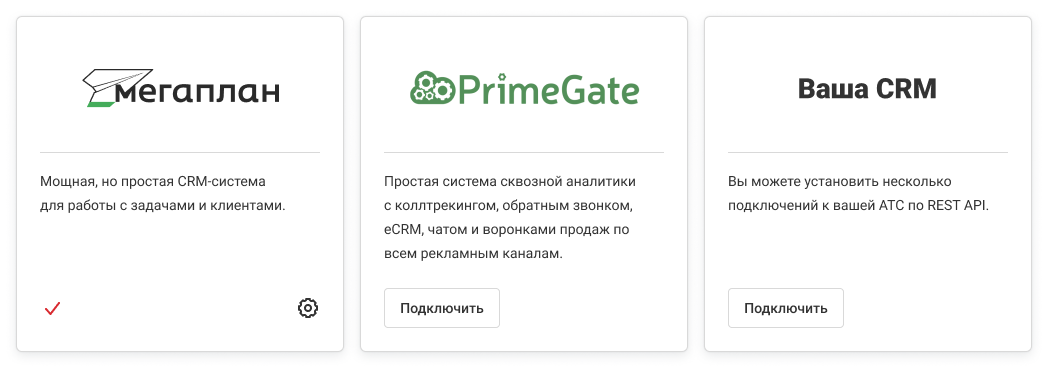 3. В интерфейсе Виртуальной АТС войдите в раздел «Интеграция с CRM», там показаны карточки CRM, интеграцию с которыми вы можете установить. Пролистните вниз и найдите карточку «Мегаплан».