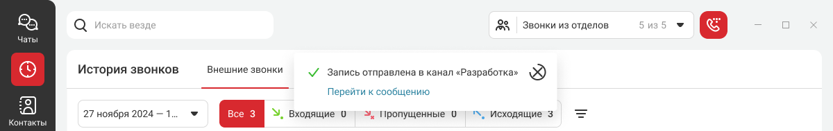 Появится окно с уведомлением об отправке записи — из него вы можете перейти в чат.