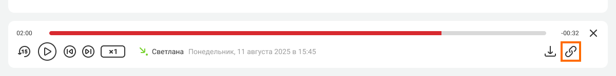 Чтобы поделиться записью звонка в чате, в проигрывателе нажмите на иконку ссылки в правом нижнем углу.