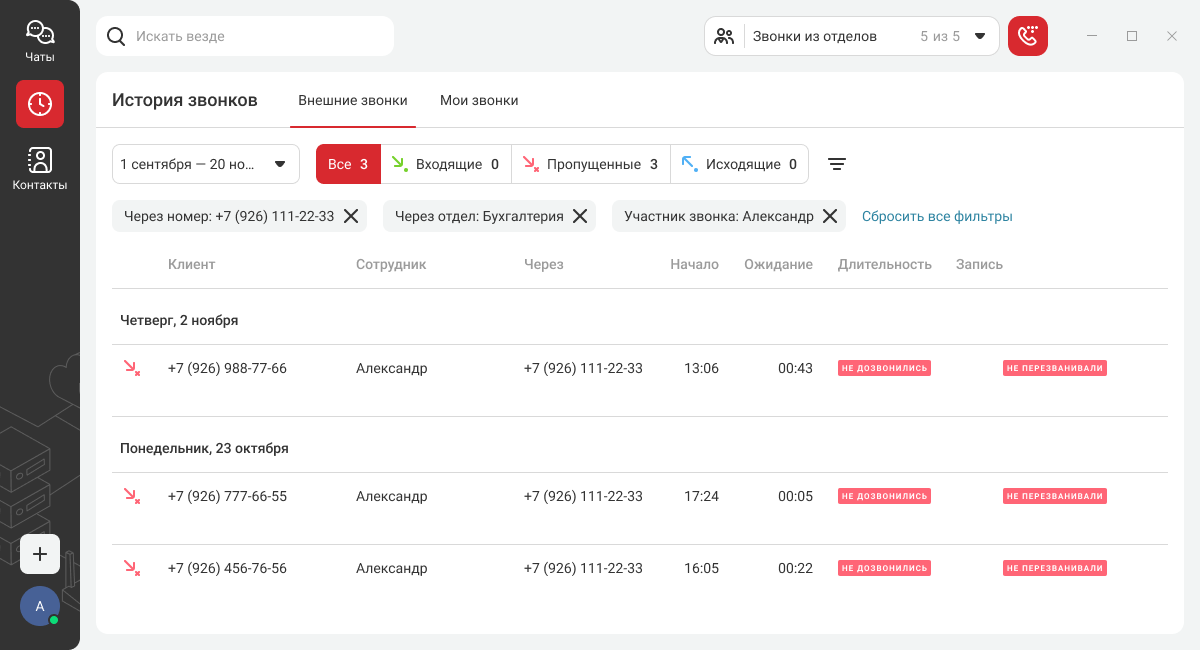 Благодаря фильтру «Контроль пропущенных» вы сможете легко найти непринятые звонки, на которые сотрудники не перезванивали или не дозвонились.