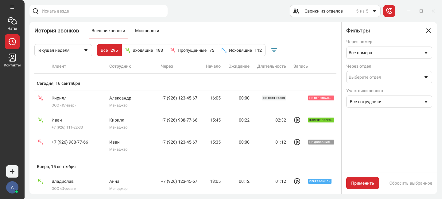 • фильтровать звонки по номерам, отделам, сотрудникам, клиентам и типам вызовов за нужный период;