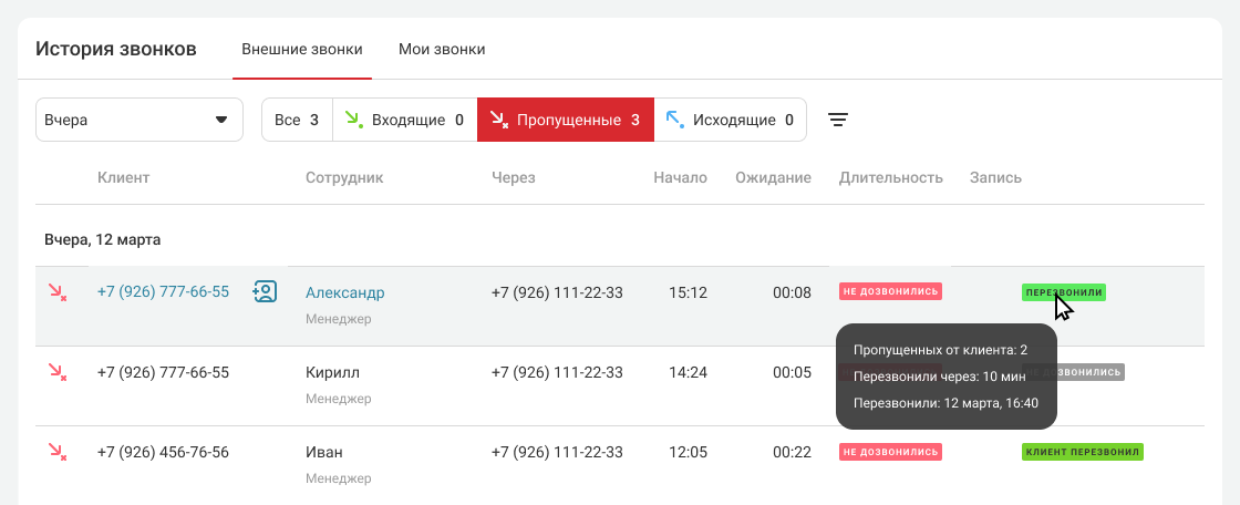При переходе в историю новый пропущенный звонок подсвечивается красным. Уведомление исчезает, если долго держать вкладку с новым пропущенным открытой или если кто-то из сотрудников перезвонит этому контакту. Чтобы перезвонить по пропущенному, наведите курсор на соответствующую строку и нажмите на кнопку «Позвонить» справа.