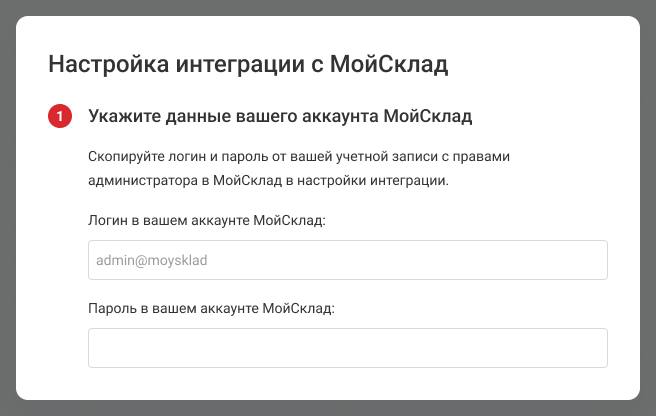 В открывшемся окне настройки интеграции укажите логин и пароль от вашего аккаунта администратора в МойСклад.