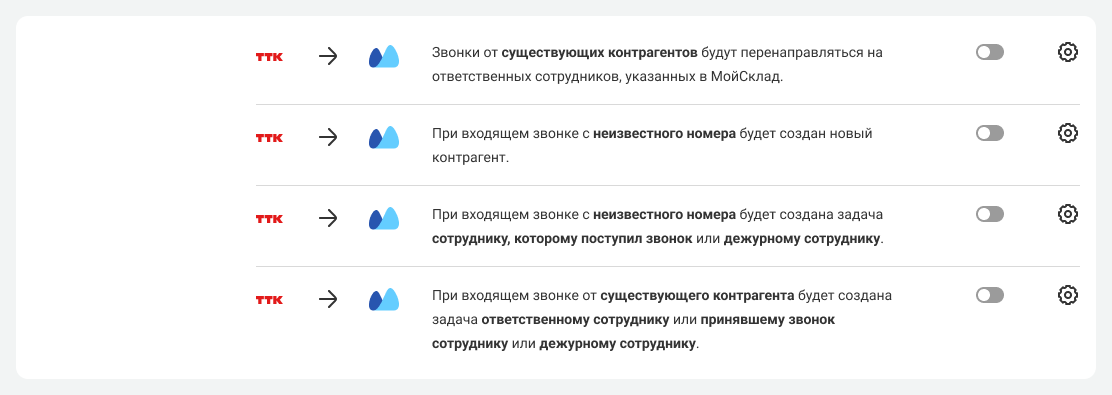 10. Настройте сценарии (правила) интеграции сервиса МойСклад и Виртуальной АТС. Некоторые сценарии интеграции подключаются автоматически без возможности внести в них изменения.