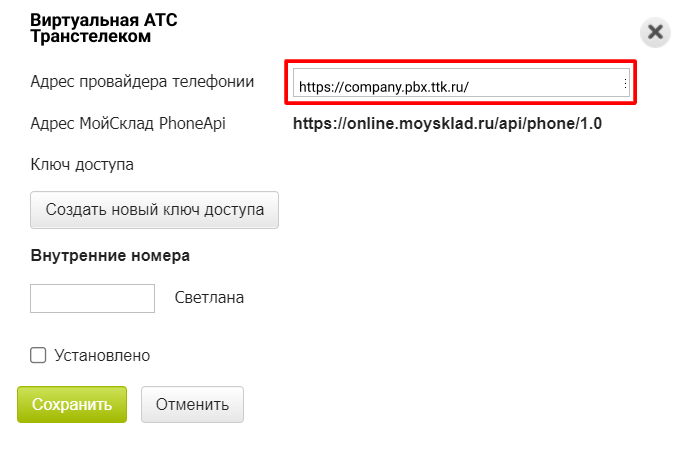 4. В поле «Адрес провайдера телефонии» вставьте адрес вашей Виртуальной АТС, скопированный на шаге 2.