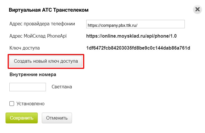 6. Вернитесь в интерфейс Виртуальной АТС и в поле «Ключ доступа» вставьте скопированный ключ.