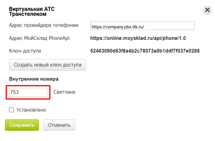 7. Перейдите в интерфейс МойСклад и сопоставьте пользователей Виртуальной АТС и сервиса МойСклад, указав их внутренние номера.