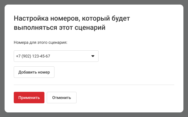 Если ваша компания использует несколько номеров, вы можете указать в настройках, на каких номерах будет работать интеграция с МойСклад. Для этого в разделе «Настроенные сценарии интеграции» нажмите кнопку «Добавить сценарий».