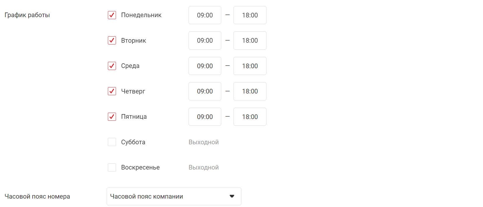 Здесь вы настроите расписание приема звонков в рабочие часы и выберете, куда их переадресовать в нерабочее время.